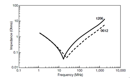 對(duì)于各類(lèi)表面貼裝的不同封裝的電感值,可以利用方程2中所描述的測(cè)量技術(shù)來(lái)計(jì)算。例如,如果系統(tǒng)中產(chǎn)生了800MHz的噪聲,隨后可以在PCB上將其定位到一個(gè)確定的區(qū)域。選擇一個(gè)標(biāo)稱(chēng)容量為39pF的電容,并將其安裝到盡可能靠近產(chǎn)生噪聲的地方,這對(duì)于減小EMI來(lái)說(shuō),將是最好的選擇。減小矩形芯片電感的一個(gè)有效方式就是改進(jìn)芯片縱長(zhǎng)方向端頭的設(shè)計(jì)。所選電容器的阻抗曲線如圖4所示。注意通過(guò)改變縱橫比,寄生電感減小了大約50%,即從1200pH減小到600pH。這有效地偏移開(kāi)了最大衰減點(diǎn),故在利用這些器件來(lái)進(jìn)行EMI濾波時(shí)只需牢記這一點(diǎn)。