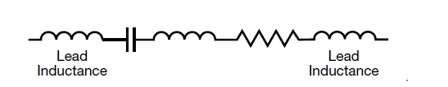 引腳電容相對(duì)于表面貼裝電容器,除了增加了引腳之外,其他并沒(méi)有什么不同。其等效模型與MLCC模型一樣,除了增加了引腳所產(chǎn)生的電感之外,見(jiàn)圖5。