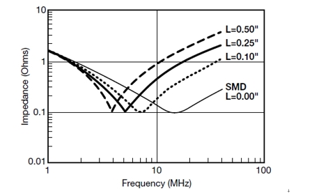 引腳所產(chǎn)生的電感對(duì)阻抗的影響如圖6所示。一個(gè)很好的經(jīng)驗(yàn)算法是,電路板上每0.10"的引腳長(zhǎng)度將產(chǎn)生2.5nH的電感。就像低電感電容器將頻率向高處偏移一樣,引腳器件將頻率往低端偏移。要實(shí)現(xiàn)最佳的EMI濾波,必須牢記這一點(diǎn)。