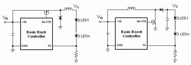 圖1:帶有Vo計算的Bulk和BoostLED驅(qū)動:buck:VO=nxVF,VO<VIN;boost:VO=nxVF,Vo>VIN。