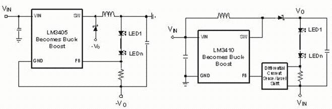 單電感Buck-boost可以像Buck或Boost調(diào)節(jié)器一樣組建,使它在系統(tǒng)成本的角度來講很吸引人。這種拓撲的一個缺點是Vo被反置(圖2a)或者以VIN為參照(圖2b)。測平移動或者反偏電路必須要用一些轉(zhuǎn)換器。像boost轉(zhuǎn)換器,它們有一個不連續(xù)輸出電流,并且需要一個輸出電容來維持一個持續(xù)LED電流。功率MOSFET要承受一個峰值為IIN加上IF的電流還有一個峰值為VIN加上VO的電壓。