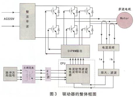 驅動器的主回路采用交—直—交電壓型逆變器形式,由整流濾波電路、三相逆變器以及步進電機等組成。整流濾波電路構成直流電壓源,完成200V、50Hz交流電源到直流電源的變換。逆變器實現從直流電到變頻變壓交流電的轉換,為三相混合式步進電機的定子繞組提供要求的交流電流。逆變器由仙童公司生產的六只G30N60B3DMOS管組成,構成三相逆變橋,驅動器采用兩只電阻檢測步進電機相電流的瞬時值。功率驅動電路的核心是功率模塊(MOS管),MOS管與電流追蹤型PWM輸出之間必須通過專用高速光耦連接,根據MOS管的過流值和電機峰值線電流的峰值小于MOS管的最大電流值。