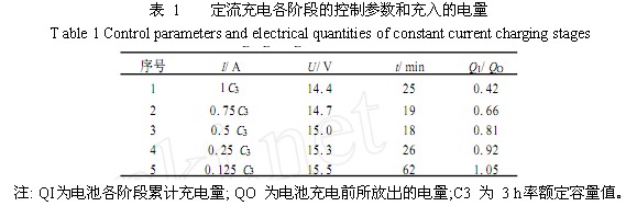 (1) 采用容量梯度法確定階段恒流充電終止標準。通過理論分析和大量試驗研究 ,本文認為采用容量梯度參數 dU / dC 作為階段恒流充電終止判斷標準較為適宜 。按該型電池恒流充電特性曲線確定充電終止容量梯度參數 ,充電過程中控制器以設定的頻度對充電電壓進行采樣 ,計算I ( n) 下的容量梯度值 ,并與設定的充電終止容量梯度標準進行比較 ,根據比較結果判斷是否終止當前階段恒流充電 。