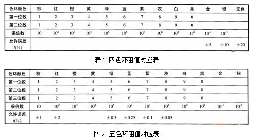 現在常用的固定電阻都用色環法來表示它的標稱阻值和誤差。色環法就是用顏色表示元件的標稱阻值和誤差,并直接標志在產品上的一種方法。常見的色環電阻有四環和五環電阻兩種(其中五環電阻屬于精密電阻)。一般由四道色環或五道色環來表示其標稱阻值和誤差,各種顏色代表不同的數值,色環顏色所代表的數字或意義如表1和表2所示。