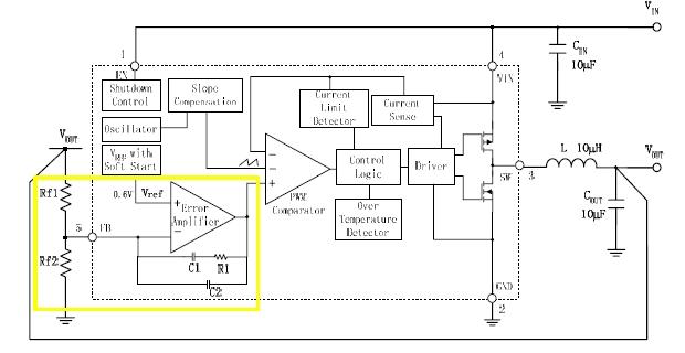 為了實現(xiàn)系統(tǒng)的抗干擾能力,Buck變換器除了主功率部分以外,還會有相應(yīng)的負反饋控制電路,補償網(wǎng)絡(luò)是反饋控制電路的一部分。補償網(wǎng)絡(luò)的加入可以提高環(huán)路的低頻增益,從而提高抗干擾能力;同時補償網(wǎng)路使系統(tǒng)擁有足夠的相位裕度,從而保證系統(tǒng)處于穩(wěn)定的工作狀態(tài),不會振蕩。圖2中黃色框內(nèi)的部分就是補償網(wǎng)絡(luò)部分,補償網(wǎng)絡(luò)中包括 R1,C1,C2和Rf1(注:Rf2在環(huán)路分析中不起作用),補償網(wǎng)絡(luò)的傳遞函數(shù)可以表示為: