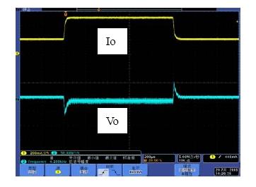系統(tǒng)的帶寬是影響系統(tǒng)動態(tài)響應(yīng)的重要因素,相位裕度是影響系統(tǒng)穩(wěn)定性的重要因素。如果選擇不同的Rf1,系統(tǒng)的帶寬和相位裕度會產(chǎn)生變化,也就是動態(tài)響應(yīng)和穩(wěn)定性會發(fā)生變化。具體以表1來分析,當(dāng)Rf1從300k變到750k,系統(tǒng)地帶寬從51.1kHz變到26.1kHz,因此系統(tǒng)的動態(tài)響應(yīng)會相應(yīng)的變差,而由于相位裕度都是足夠的,因此系統(tǒng)都處于穩(wěn)定工作的狀態(tài)。圖7和圖8是做負載切換的動態(tài)響應(yīng)測試結(jié)果,從測試結(jié)果可以看出環(huán)路響應(yīng)速度變慢,導(dǎo)致輸出電壓過沖變大,動態(tài)響應(yīng)效果變差。