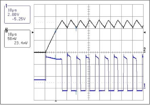 如圖7所示,Q1是降壓型充電器的開關功率晶體管;L1是濾波電感;D1是續流或整流二極管。輸入電容C1為10uF、超低ESR的陶瓷濾波電容。用鉭電容或者其它電解電容替代C1會使充電器的性能降低。R7是電流調節器檢測放大器的檢流電阻。DS2712的基準電壓為0.125V,并具有24mV滯回。通過CSOUT提供閉環、開關模式電流控制。充電控制引腳CC1將Q2的柵極拉低時,使能Q1的柵極驅動。Q1和Q2均為低Vt (柵-源門限電壓)的pMOSFET。CC1和CSOUT均為低電平時,Q2的漏-源電壓將稍大于Vt。該電壓以及CSOUT的正向壓降構成了Q1的柵極開關電壓。CC1為低電平時,啟動電流閉環控制。圖8所示為啟動開關時的波形。上方波形是0.125Ω (檢流電阻兩端的電壓,下方波形是Q1漏極至GND的電壓。開始時,當Q1打開(CC1和CSOUT均為低電平)時,電感電流向上爬升。當電流增大到使檢流電阻兩端的電壓達到0.125V時,CSOUT變為高電平,開關關斷。此后,電感電流開始下降,直到檢流電阻兩端的電壓達到約0.1V,CSOUT又變為低電平。只要CC1為低電平,該過程將一直持續。