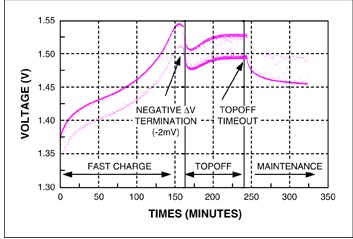 通常采用恒流源對NiMH電池充電。當達到充滿狀態時,會發生放熱化學反應,并導致電池溫度上升,電池端電壓降低。可檢測電池溫度上升速率或者負向電壓變化率,并用來終止充電。這些充電終止方法分別稱為dT/dt和-ΔV。充電速率非常低時,dT/dt和-ΔV不太明顯,很難精確檢測到。電池開始進入過充狀態時,dT/dt和-ΔV響應開始顯現。此時如果繼續充電,將損壞電池。