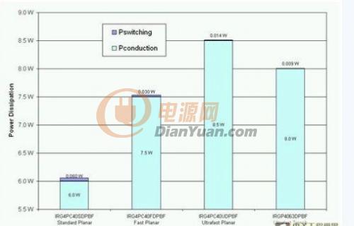 低壓側(cè)IGBT同樣有同一問題。究竟哪一種IGBT才能提供最低的功耗?由于這些IGBT只會(huì)進(jìn)行 50Hz或60Hz切換,如圖5所示,標(biāo)準(zhǔn)速度IGBT可提供最低的功耗。雖然標(biāo)準(zhǔn)IGBT會(huì)帶來(lái)一些開關(guān)損耗,但數(shù)值并不足以影響IGBT的總功耗。事實(shí)上,最新的槽柵IGBT仍然擁有較高的功耗,因?yàn)檫@一代的槽柵IGBT專門針對(duì)高頻率應(yīng)用而設(shè)計(jì),以平衡開關(guān)和導(dǎo)通損耗為目標(biāo)。因此,對(duì)低壓側(cè)IGBT 來(lái)說,標(biāo)準(zhǔn)速度平面式IGBT仍然是必然選擇。