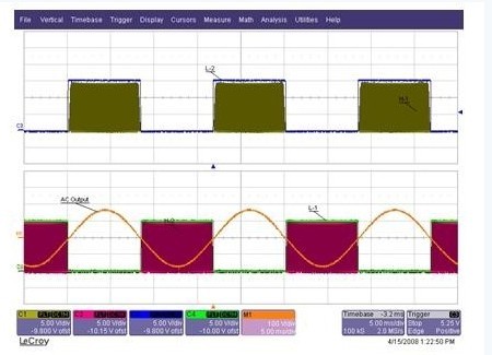 脈寬調(diào)制這些IGBT的最佳方法是什么?怎樣才能把功耗降到最低呢?方法之一是僅對(duì)高壓側(cè)IGBT進(jìn)行脈寬調(diào)制,對(duì)應(yīng)的低壓側(cè)IGBT以50Hz或60Hz換相。圖2所示為一個(gè)典型的柵壓信號(hào)。當(dāng)Q1 正進(jìn)行脈寬調(diào)制時(shí),Q4維持正半周期操作。Q2和Q3在正半周期保持關(guān)斷 。到了負(fù)半周期,當(dāng)Q3進(jìn)行脈寬調(diào)制時(shí),Q2保持開啟狀態(tài)。Q1和Q4會(huì)在負(fù)半周期關(guān)斷。圖2 也顯示了通過輸出濾波電容器C1的AC正弦電壓波形。