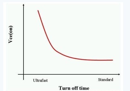 IGBT基本上是具備金屬門氧化物門結(jié)構(gòu)的雙極型晶體管 (BJT) 。這種設(shè)計(jì)讓IGBT的柵極可以像MOSFET一樣,以電壓代替電流來(lái)控制開關(guān)。作為一種BJT,IGBT的電流處理能力比MOSFET更高。同時(shí),IGBT亦如BJT一樣是一種少數(shù)載體元件。這意味著 IGBT關(guān)閉的速度是由少數(shù)載體復(fù)合的速度快慢來(lái)決定。此外,IGBT的關(guān)閉時(shí)間與它的集極-射極飽和電壓 (Vce(on)) 成反比(如圖3所示)。
