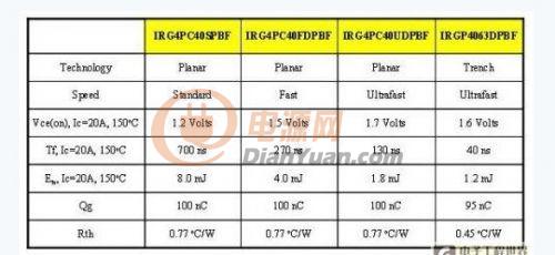 表1顯示了四個(gè)擁有相同尺寸的IGBT的參數(shù)值。前三個(gè)IGBT采用同樣的平面式技術(shù),但使用不同的壽命復(fù)合控制計(jì)量。從表中可見,標(biāo)準(zhǔn)速度的IGBT具有最低Vce(on) ,但與快速和超速平面式IGBT相比,標(biāo)準(zhǔn)速度的IGBT下降時(shí)間最慢。第四個(gè)IGBT是經(jīng)優(yōu)化的槽柵IGBT,能夠?yàn)樘?yáng)能逆變器這類高頻率切換應(yīng)用提供低導(dǎo)通和開關(guān)損耗。請(qǐng)注意,槽柵IGBT的Vce(on) 和總切換損耗 (Ets) 比超速平面式IGBT低。