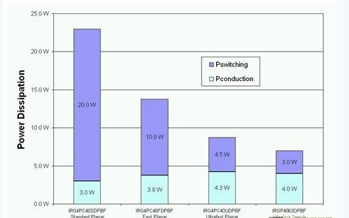 前文討論了高壓側(cè) IGBT在20kHz或以上頻率進(jìn)行切換。假設(shè)設(shè)計(jì)一個(gè)擁有230V交流輸出的1.5kW 太陽(yáng)能逆變器,表1中哪種IGBT具有最低的功耗呢?圖4顯示了IGBT在20kHz進(jìn)行切換的功耗分析,由此可見超速平面式IGBT比其它兩種平面式 IGBT具有更低的總功耗。