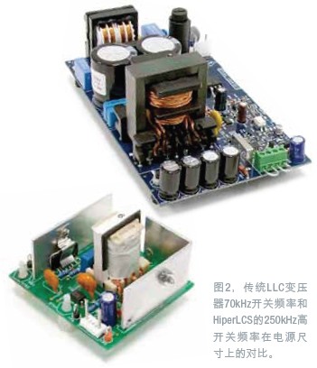 在高壓電源轉換電路設計中,諸如電源噪聲、開關頻率、開關損耗、電源體積、可靠性等問題一直是關鍵所在。與其它的高壓拓撲結構相比,LLC轉換器因效率高且設計的電源體積小,在高壓電源適用領域一直受到設計師的青睞,不過其設計難度也非常大。Power Integrations公司(PI)不久推出的HiperLCS系列LCS700-708高壓LLC電源IC,將變頻控制器、高壓端和低壓端驅動器以及兩個MOSFET同時集成到了一個低成本封裝中,具有出色的設計靈活性,其最高負載效率超過97%,并利用高頻開關來減小變壓器的尺寸和輸出電容的占板面積,由此達到縮小電源尺寸的目的。圖1所示為HiperLCS功率級的電路簡圖,其中LLC諧振電感集成在變壓器中。變頻控制器通過零電壓(ZVS)開關功率MOSFET,消除開關損耗,從而達到高效率。