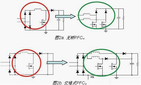 改善PFC能效的目標是為了實現功率因數校正短的效率達到96%以上。采用無橋PFC(圖2a)可以減少橋損耗,采用交錯式PFC(圖2b)可以滿足較高功率應用的要求,以提升PFC能效。此外,還可以利用IC技術減少開關損耗,并利用更優化的拓撲結構來減少EMI濾波器損耗。