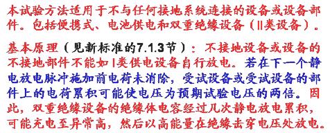 關于不接地設備的試驗配置,新版標準與舊版標準的配置是相同的。關鍵是在單次放電時(無論是空氣的,還是接觸的),試品上的電荷應當在每次施加靜電放電脈沖之前先行釋放(釋放掉在需要施加靜電放電的金屬點或金屬部位上的電荷)。