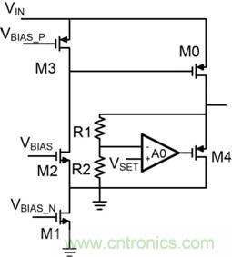 圖3:M4位于放大器反饋環(huán)路中、無(wú)輸出電容器的LDO。