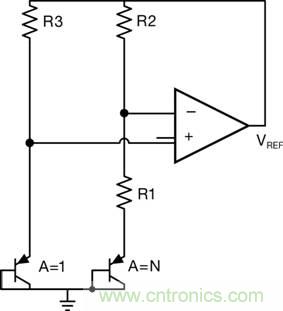 電阻器R2和R3分別可確定通過Q1和Q2 的電流值。R2和R3的變化可導(dǎo)致參考電壓(公式5)的正溫度系數(shù)不準(zhǔn)確。不過,可通過對(duì)電阻器R2與R3進(jìn)行良好匹配來(lái)降低該變化所引起的誤差。