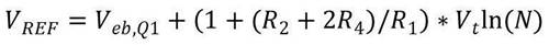 通過添加雙極性晶體管的負(fù)溫度系數(shù)基射極間電壓,可獲得帶隙電壓的低溫系數(shù),從而可通過在不同電流密度下偏置的兩個(gè)基射極間電壓之差獲得正溫度系數(shù)電壓。為電阻器R2和R3選擇相等的值,參考電壓就可表示為公式5: