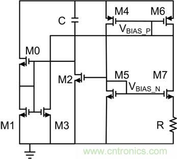 偏置發(fā)生器通常不需要特別啟動(dòng)電路,這可減少靜態(tài)電流和占用面積。如果電流足夠小,電阻R 就可以忽略。由M5/M7和M4/M6構(gòu)成的兩個(gè)電流鏡可互連成一個(gè)閉環(huán)。