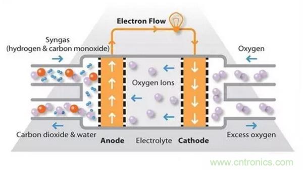 SOFC使用固體陶瓷電解質,例如用氧化釔穩定的氧化鋯,而不是液體或膜。它們的高工作溫度意味著燃料可以在燃料電池本身內重整,消除了對外部重整的需要,并允許單元與各種烴燃料一起使用。與其它類型的燃料電池相比,它們還相對耐燃料中的少量硫,因此可以與煤氣一起使用。
