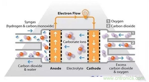 熔融碳酸鹽燃料電池(MCFC)使用懸浮在多孔陶瓷基體中的熔融碳酸鹽作為電解質。通常使用的鹽包括碳酸鋰,碳酸鉀和碳酸鈉。