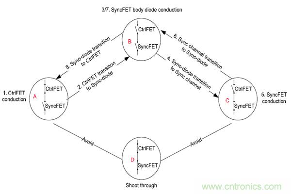 同步降壓穩壓器主要有3種工作狀態,其開關順序是A-B-C-B-A,如圖2所示。