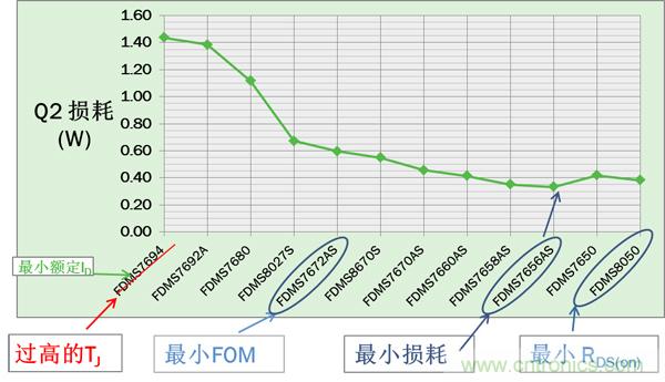 對于Q2,VIN= VINMAX時損耗最大。圖3所示的12個器件中,FDMS7656AS有最低的最大損耗。但由于Q2 寄生參數會影響Q1的 開關損耗, 最小Q2 損耗通常并不意味著最佳的總能效。必須比較Q1及Q2的總功耗來找到最佳的Q2以實現最高能效。