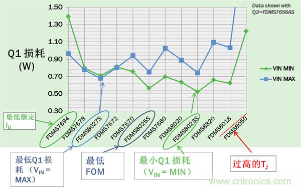 對于Q1,VIN= VINMAX或VINMIN時損耗最大。圖4所示的12個器件中,FDMS8027S和FDMS8023S分別在VIN= VINMAX和VINMIN時有最低的最大損耗的Q1。