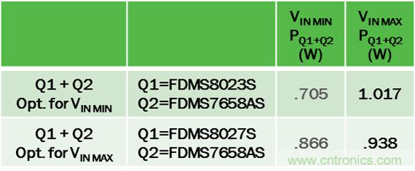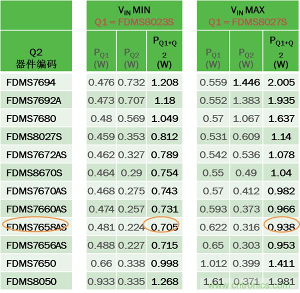 為優化轉換器能效,首先根據VIN選擇損耗最小的Q1,然后選擇產生損耗最小的Q2。本例中, 無論VIN最小或最大,最佳的Q2是相同的,都為FDMS7658AS(但并不總是如此,特別是具有寬VIN范圍或高FSW時)。