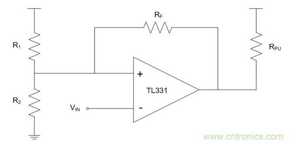 下面的例子所示為安森美半導體TL331配置為一個反相施密特觸發器。L331是無內部滯回的單通道、低功耗、集電極開路的比較器。由R1和R2電阻創建的電阻分壓器在非反相引腳上設置參考電壓,在比較器輸出開關處設置閾值電壓。由于這是一個集電極開路的比較器,所以連接一個上拉電阻到輸出。反饋電阻通過正反饋增加滯回。通常情況下,使用一個比較大的反饋電阻值,至少100 KΩ。
