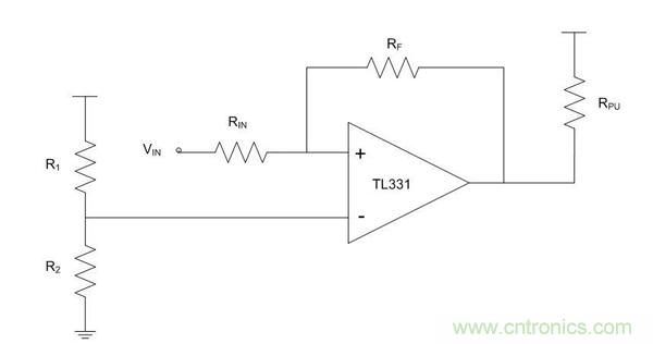 圖2.比較器配置為非反相施密特觸發器