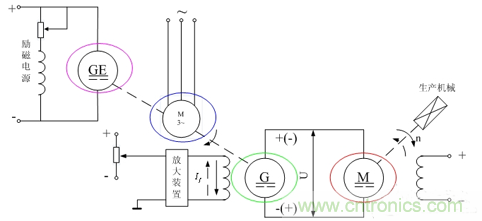 圖中,交流電動機(圖1中的藍色圈顯現)為原動機,工作時轉速基本恒定。由它拖動的直流發電機G(圖-1中的綠色圈顯現秒)給需要調速的直流電動機M(圖1中的紅色圈顯現)的電樞供電。GE(圖1中的紫色圈顯現)為一臺小型直流發電機,可以如圖那樣與交流電動機、直流發電機G同軸相連,也可另設一臺小型交流電動機對其拖動。它在系統中的作用是提供一小容量的直流電源,供直流發電機G(圖1中的綠色圈顯現)和直流電動機M(圖1中的紅色圈顯現)的定子勵磁用,所以又稱GE為勵磁發電機。