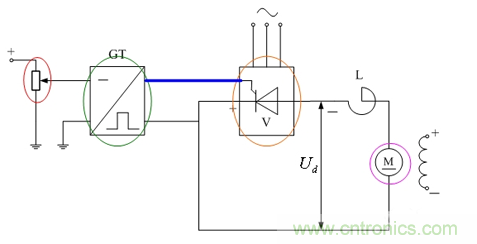 晶閘管整流裝置供電的直流調速系統如圖。GT(圖2中的綠色圈顯現)為晶閘管的觸發裝置,V(圖2中的橙色圈顯現)為晶閘管整流器,合起來為一可控直流電源。可控直流電源給直流電動機M(圖2中的紫色圈顯現)電樞供電組成直流調速系統。這類直流調速系統簡稱V-M系統。
