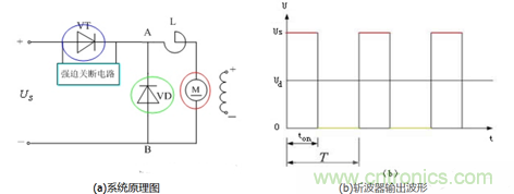當晶閘管VT(圖3中的藍色圈顯現)被觸發導通時,電源電壓Us加到電動機M(圖3中的紅色圈和線段顯現)的電樞上;當VT在控制信號的作用下,通過強迫關斷電路(圖3中的淺藍色框顯現)關斷時,電源與電動機電樞斷開,電動機經二極管VD(圖3中的綠色圈顯現)續流,此時A、B兩點間(即電樞兩端)電壓接近零(圖3中的黃色線段顯現)。若使晶閘管VT反復通斷,就可得到A、B間的電壓波形如(b)圖所示。由波形看來,就好像電源電壓Us在一段時間內(從ton到T)被斬掉后形成的,這也是斬波器這一名稱的由來。