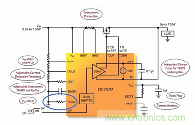 LTC7000 能夠避免負載遭受 VIN 引腳上的過壓和欠壓情況的損壞。“一個連接在 VIN 和地之間、且抽頭連接至 RUN 和 OVLO 引腳的簡單電阻分壓器將設定一個針對負載的有效操作窗口。當 VIN 位于由 RUN 和 OVLO 引腳所設定的操作窗口之外時,則關斷外部 MOSFET,并保護負載免遭潛在損壞或發(fā)生故障。” Mark Mullen這樣談到。