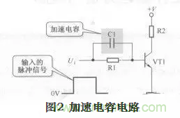 (3)加速截止過程;當(dāng)輸入信號(hào)電壓U從高電平突然跳變到OV時(shí),如圖3(b)所示的tl時(shí)刻,由于Cl上原先充到的電壓極性為左正右負(fù),加到VT1基極的電壓為負(fù)尖頂脈沖。由于加到VT1基極的電壓為負(fù),加快了VT1從基區(qū)抽出電荷的過程,VT1以更快的速度從飽和轉(zhuǎn)換到截止?fàn)顟B(tài),即縮短了VT1向截止轉(zhuǎn)換的時(shí)間。