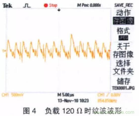 圖3 所示為空載時MAX606 輸出電壓紋波波形(Uo≈12 V),即開關紋波,其頻率為1.18 kHz,波形穩定,Vpp=240 mV。圖4 所示為負載120 Ω 時輸出電壓的紋波波形,從圖4 中可以看出加入負載后電源紋波變得比較復雜,其最高Vpp達到1.2 V。為系統供電時,該紋波將會對系統造成嚴重危害,必須對此紋波進行抑制。
