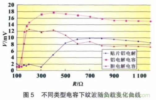 在圖1 的CLC 濾波電路中,Cin、Cout 分別使用三種常見類型的電解電容(容值為220 μF/16 V),電感使用環形電感(電感值120 μH),依次改變負載大小,使用交流毫伏表測量其紋波電壓有效值,得到如圖5 所示的曲線圖。