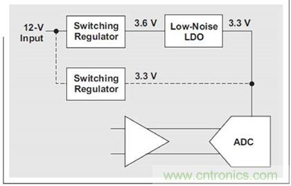 極大降低系統(tǒng)功耗的一種方法是對(duì)高速數(shù)據(jù)轉(zhuǎn)換器的電源進(jìn)行優(yōu)化。數(shù)據(jù)轉(zhuǎn)換器 設(shè)計(jì)和工藝技術(shù)的一些最新進(jìn)展,讓許多新型 ADC 可以直接由開(kāi)關(guān)電源來(lái)驅(qū) 動(dòng),從而達(dá)到最大化功效的目的。 系統(tǒng)設(shè)計(jì)人員們習(xí)慣在開(kāi)關(guān)穩(wěn)壓器和 ADC 之間使用一些低噪、低壓降穩(wěn)壓器 (LDO),以清除輸出噪聲和開(kāi)關(guān)頻率諧波(請(qǐng)參見(jiàn)圖 1)。但是,這種干凈的電 源設(shè)計(jì)的代價(jià)是高功耗,因?yàn)?LDO 要求壓降余量來(lái)維持正常的運(yùn)行。最低壓降 一般為 200 到 500mV,但在一些系統(tǒng)中其可以高達(dá) 1 到 2V(例如,ADC 的3.3-V 電壓軌產(chǎn)生自一個(gè)使用 LDO 的 5V 開(kāi)關(guān)電源時(shí))。