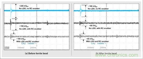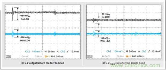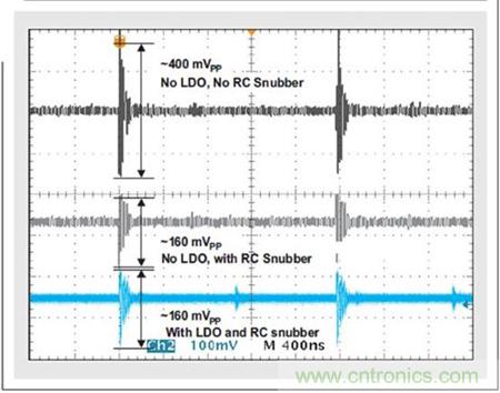 圖 3 實(shí)驗(yàn) 2(使用 LDO)和實(shí)驗(yàn) 3(無(wú) LDO)的示波器截圖對(duì)比
