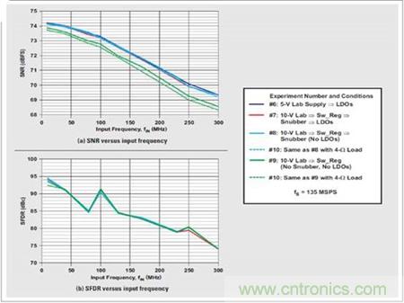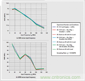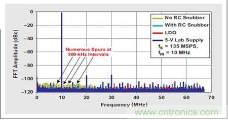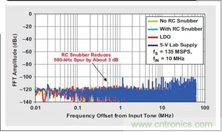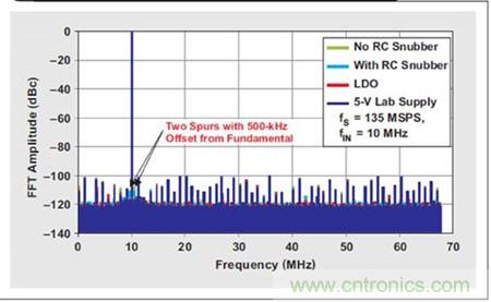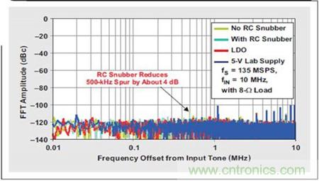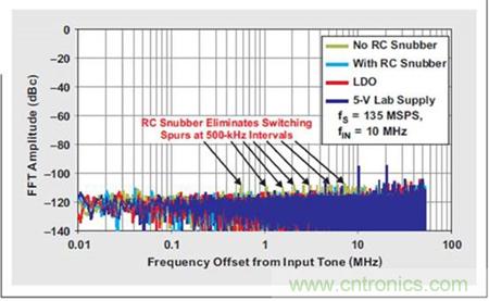 5 個(gè)實(shí)驗(yàn)的 FFT 曲線(xiàn)圖對(duì)比(請(qǐng)參見(jiàn)圖 6)顯示噪聲底限或雜散振幅沒(méi)有出現(xiàn) 較大的增加。使用 LDO 清除開(kāi)關(guān)噪聲使得輸出頻譜看起來(lái)幾乎與干凈 5-V 實(shí) 驗(yàn)室電源完全一樣。去除 LDO 以后,我們觀(guān)測(cè)到從開(kāi)關(guān)穩(wěn)壓器產(chǎn)生了兩個(gè)雜散, 其具有一個(gè)來(lái)自 10-MHz 輸入音調(diào)的約 500 kHz 頻率偏置。RC 緩沖器電路降 低這些雜散振幅 約 3dB,從約 –108 dBc 降到了約 –111 dBc。這一值低于 ADS5483 的平均雜散振幅,其表明 ADS5483 可以在不犧牲 SNR 或 SFDR 性 能的情況下直接由一個(gè)開(kāi)關(guān)穩(wěn)壓器來(lái)驅(qū)動(dòng)。