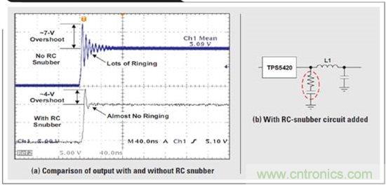 RC 緩沖器 降壓穩(wěn)壓器輸出能夠以相當(dāng)高的開(kāi)關(guān)速度對(duì)非常大的電壓實(shí)施開(kāi)關(guān)操作。本文 中,將 TPS5420 的輸入電壓軌設(shè)定為 10V,我們可以在輸出端觀(guān)測(cè)到許多過(guò)沖 和振鈴,如圖 7a 所示。為了吸收一些電源電路電抗能量,我們將 RC 緩沖電 路添加到了 TPS5420 的輸出(請(qǐng)參見(jiàn)圖 7b)。