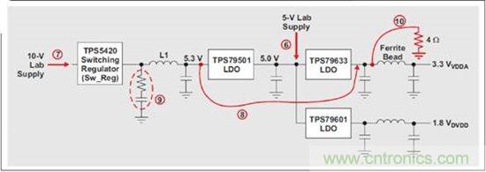 實(shí)驗(yàn) 6—將一個(gè) 5-V 實(shí)驗(yàn)室電源連接到兩個(gè)低噪聲 LDO(一個(gè)使用 3.3-V 輸 出,另一個(gè)使用 1.8-V 輸出)的輸入。LDO 并未給實(shí)驗(yàn)室電源帶來(lái)任何有影響 的噪聲。實(shí)驗(yàn) 7—將一個(gè) 10-V 實(shí)驗(yàn)室電源連 接到 TPS5420 降壓穩(wěn)壓器,其與 一個(gè)5.3-V 輸出連接,像“實(shí)驗(yàn) 2”連接 ADS5483 一樣。TPS79501 生成了一個(gè)過(guò)濾后的 5.0-V 電壓軌,其向 3.3-V 輸出和 1.8-V 輸出 LDO 提供輸入,如圖 10所示。 實(shí)驗(yàn) 8—所有 3.3-VVDDA 電壓軌 LDO 均被繞過(guò)。TPS5420 配置為一個(gè) 3.3-V 輸出,該輸出直接連接到 3.3-VVDDA 電壓軌。TPS79601 生成 1.8-VDVDD 電壓軌, 并通過(guò)一個(gè)外部 5-V 實(shí)驗(yàn)室電源供電。
