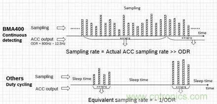 可是,如我們前述“加速度傳感器在物聯網應用中扮演重要角色”,傳感性能決定了系統能否基于傳感器做出精準的識別和決策。為了提高對原始信號的有效采集,并降低噪聲及高頻信號的干擾(混疊Aliasing),BMA400在正常工作模式下,采用了連續采樣和滑動低通濾波的方式。