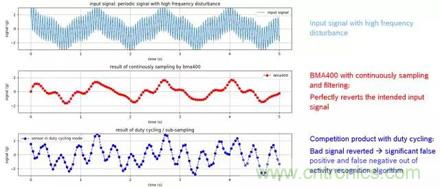 下圖顯示了連續采樣(continuous sampling)和周期休眠(duty cycling)兩種不同的采樣模式對于高頻噪聲的抗干擾能力的顯著區別。
