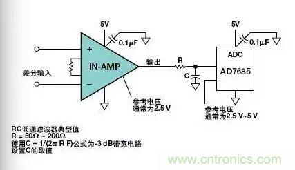 圖7.儀表放大器驅動ADC的典型單電源電路