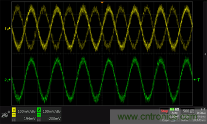 觸發(fā)耦合其實就是一種對觸發(fā)信號的低通或高通濾波。因此可對噪聲大的信號加入“高頻抑制”耦合,過濾掉其中高頻部分,使得波形觸發(fā)穩(wěn)定如圖5所示。