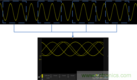 示波器的觸發(fā)條件的一個很關(guān)鍵的因素是觸發(fā)電平,觸發(fā)電平大多數(shù)情況下是用一根直流電平作為基準(zhǔn),當(dāng)信號的電壓超過該直流電平的時刻作為采樣波形的起始點。由于起始采樣的位置是有規(guī)律的,因此多次采樣的波形進行疊加后看上去還是一個穩(wěn)定的波形。如圖3所示: