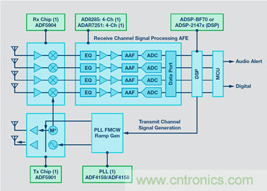 ADI公司負責24GHz芯片組的應(yīng)用工程師Patrick Walsh在介紹此方案時指出,這是ADI最新的開發(fā)平臺——演示雷達,演示雷達是一款完整的天線到比特解決方案,擁有完整的ADI信號鏈。這個產(chǎn)品包括一個兩通道發(fā)送,四通道接收解決方案,提供執(zhí)行FM-CW調(diào)制的斜坡PLL,ADC可以將基帶信號轉(zhuǎn)換進入DSP,為我們提供完整的信號鏈。該演示雷達只需連接USB和電源,用戶就可以啟動運行,在幾分鐘之內(nèi)收到雷達信號。